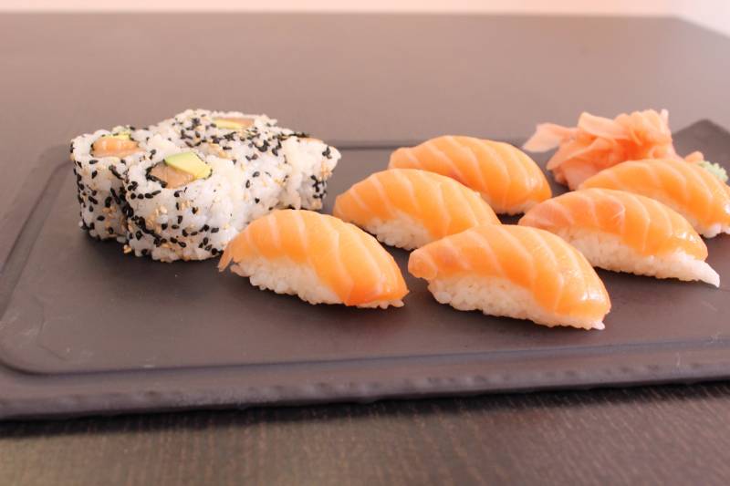 6 sushis saumon, 8 makis saumon, 6 california saumon avocat
